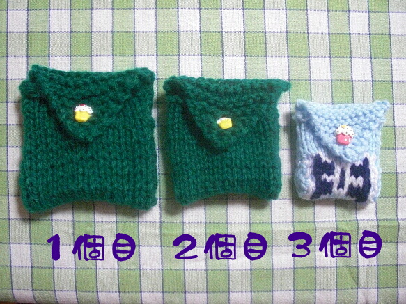 アメリカもフランスもごちゃ混ぜになりながらも何とか仕上げた1個目は、どう見ても目薬ポーチではなくどら焼きポーチ。これはやっぱり針のサイズが違うんだと思って、針を買ってきてリベンジしたのが2個目。すこしはましになったけどまだサイトに載っているのに比べるとずいぶん大きい。極太の緑の糸がちょうど終わったので、前に買ってあった並太の毛糸で再チャレンジ。ちょっと欲も出して自己流で模様を編み込んだりして、やっとまともな大きさの目薬ポーチができました。良かった良かった。